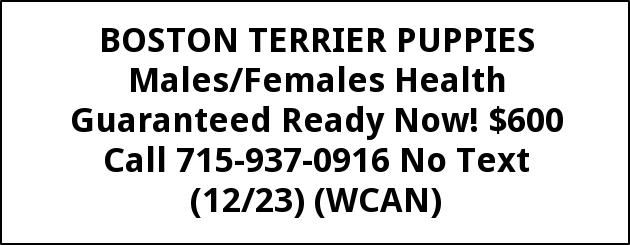 BOSTON TERRIER PUPPIES Males/Females Health Guaranteed Ready Now! $600 Call 715-937-0916 No Text (12/23) (WCAN)