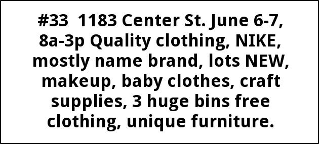#33 1183 Center St. June 6-7, 8a-3p Quality clothing, NIKE, mostly name brand, lots NEW, makeup, baby clothes, craft supplies, 3 huge bins free clothing, unique furniture.