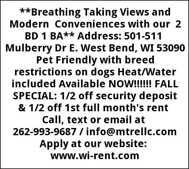 **Breathing Taking Views and Modern Conveniences with our 2 BD 1 BA** Address: 501-511 Mulberry Dr E. West Bend, WI 53090 Pet Friendly with breed restrictions on dogs Heat/Water included Available NOW!!!!!! FALL SPECIAL: 1/2 off security deposit & 1/2 off 1st full month's rent Call, text or email at 262-993-9687 / info@mtrellc.com Apply at our website: www.wi-rent.com