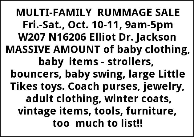 MULTI-FAMILY RUMMAGE SALE Fri.-Sat., Oct. 10-11, 9am-5pm W207 N16206 Elliot Dr. Jackson MASSIVE AMOUNT of baby clothing, baby items - strollers, bouncers, baby swing, large Little Tikes toys. Coach purses, jewelry, adult clothing, winter coats, vintage items, tools, furniture, too much to list!!