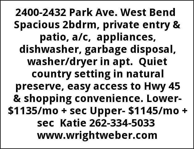 2400-2432 Park Ave. West Bend Spacious 2bdrm, private entry & patio, a/c, appliances, dishwasher, garbage disposal, washer/dryer in apt. Quiet country setting in natural preserve, easy access to Hwy 45 & shopping convenience. Lower- $1135/mo + sec Upper- $1145/mo + sec Katie 262-334-5033 www.wrightweber.com
