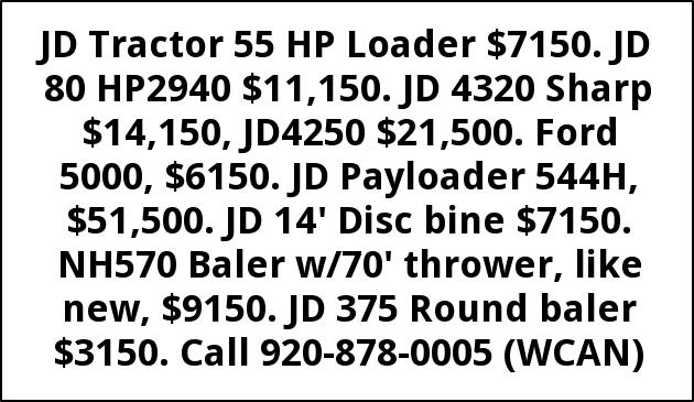 JD Tractor 55 HP Loader $7150. JD 80 HP2940 $11,150. JD 4320 Sharp $14,150, JD4250 $21,500. Ford 5000, $6150. JD Payloader 544H, $51,500. JD 14' Disc bine $7150. NH570 Baler w/70' thrower, like new, $9150. JD 375 Round baler $3150. Call 920-878-0005 (WCAN)