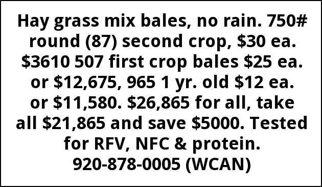 Hay grass mix bales, no rain. 750# round (87) second crop, $30 ea. $3610 507 first crop bales $25 ea. or $12,675, 965 1 yr. old $12 ea. or $11,580. $26,865 for all, take all $21,865 and save $5000. Tested for RFV, NFC & protein. 920-878-0005 (WCAN)