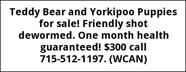 Teddy Bear and Yorkipoo Puppies for sale! Friendly shot dewormed. One month health guaranteed! $300 call 715-512-1197. (WCAN)
