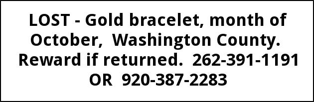 LOST - Gold bracelet, month of October, Washington County. Reward if returned. 262-391-1191 OR 920-387-2283