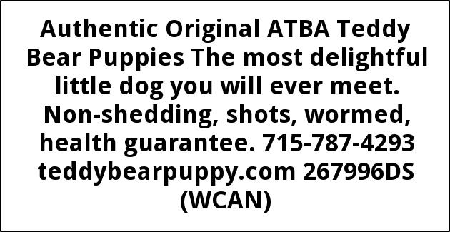 Authentic Original ATBA Teddy Bear Puppies The most delightful little dog you will ever meet. Non-shedding, shots, wormed, health guarantee. 715-787-4293 teddybearpuppy.com 267996DS (WCAN)