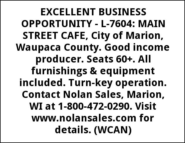 EXCELLENT BUSINESS OPPORTUNITY - L-7604: MAIN STREET CAFE, City of Marion, Waupaca County. Good income producer. Seats 60+. All furnishings & equipment included. Turn-key operation. Contact Nolan Sales, Marion, WI at 1-800-472-0290. Visit www.nolansales.com for details. (WCAN)