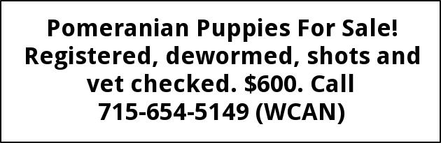 Pomeranian Puppies For Sale! Registered, dewormed, shots and vet checked. $600. Call 715-654-5149 (WCAN)