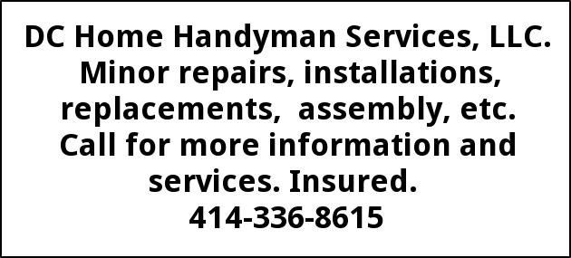 DC Home Handyman Services, LLC. Minor repairs, installations, replacements, assembly, etc. Call for more information and services. Insured. 414-336-8615