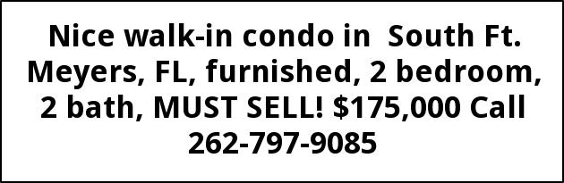 Nice walk-in condo in South Ft. Meyers, FL, furnished, 2 bedroom, 2 bath, MUST SELL! $175,000 Call 262-797-9085