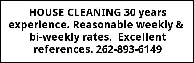HOUSE CLEANING 30 years experience. Reasonable weekly & bi-weekly rates. Excellent references. 262-893-6149
