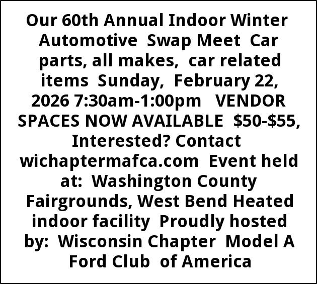 Our 60th Annual Indoor Winter Automotive Swap Meet Car parts, all makes, car related items Sunday, February 22, 2026 7:30am-1:00pm VENDOR SPACES NOW AVAILABLE $50-$55, Interested? Contact wichaptermafca.com Event held at: Washington County Fairgrounds, West Bend Heated indoor facility Proudly hosted by: Wisconsin Chapter Model A Ford Club of America