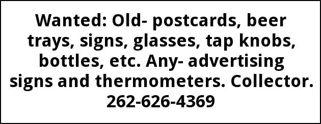 Wanted: Old- postcards, beer trays, signs, glasses, tap knobs, bottles, etc. Any- advertising signs and thermometers. Collector. 262-626-4369