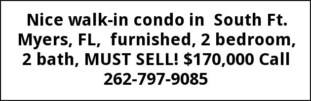 Nice walk-in condo in South Ft. Myers, FL, furnished, 2 bedroom, 2 bath, MUST SELL! $170,000 Call 262-797-9085