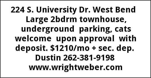 224 S. University Dr. West Bend Large 2bdrm townhouse, underground parking, cats welcome upon approval with deposit. $1210/mo + sec. dep. Dustin 262-381-9198 www.wrightweber.com