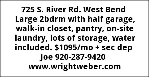 725 S. River Rd. West Bend Large 2bdrm with half garage, walk-in closet, pantry, on-site laundry, lots of storage, water included. $1095/mo + sec dep Joe 920-287-9420 www.wrightweber.com