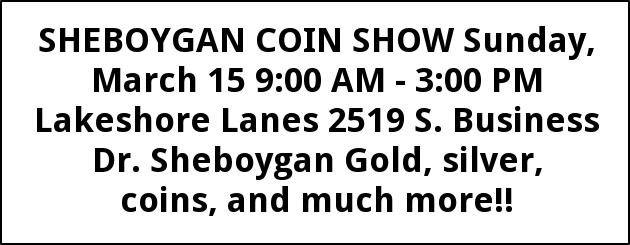 Feb 24, 2026. Sheboygan Coin Show (March 15, 2026) Collectibles Ads from Southeast Wisconsin Services