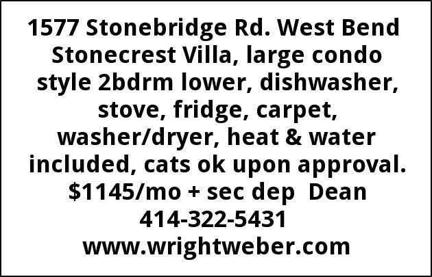 1577 Stonebridge Rd. West Bend Stonecrest Villa, large condo style 2bdrm lower, dishwasher, stove, fridge, carpet, washer/dryer, heat & water included, cats ok upon approval. $1145/mo + sec dep Dean 414-322-5431 www.wrightweber.com