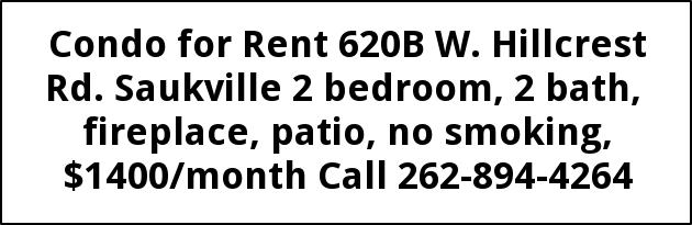 Condo for Rent 620B W. Hillcrest Rd. Saukville 2 bedroom, 2 bath, fireplace, patio, no smoking, $1400/month Call 262-894-4264