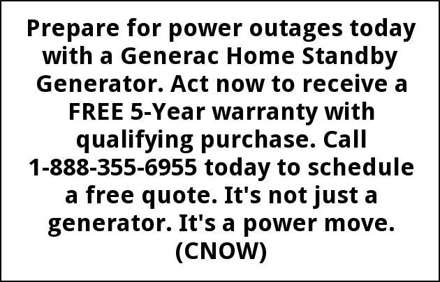 Prepare for power outages today with a Generac Home Standby Generator. Act now to receive a FREE 5-Year warranty with qualifying purchase. Call 1-888-355-6955 today to schedule a free quote. It's not just a generator. It's a power move. (CNOW)