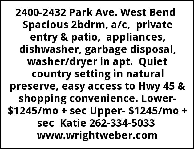 2400-2432 Park Ave. West Bend Spacious 2bdrm, a/c, private entry & patio, appliances, dishwasher, garbage disposal, washer/dryer in apt. Quiet country setting in natural preserve, easy access to Hwy 45 & shopping convenience. Lower- $1245/mo + sec Upper- $1245/mo + sec Katie 262-334-5033 www.wrightweber.com