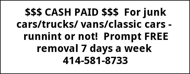 $$$ CASH PAID $$$ For junk cars/trucks/ vans/classic cars - runnint or not! Prompt FREE removal 7 days a week 414-581-8733