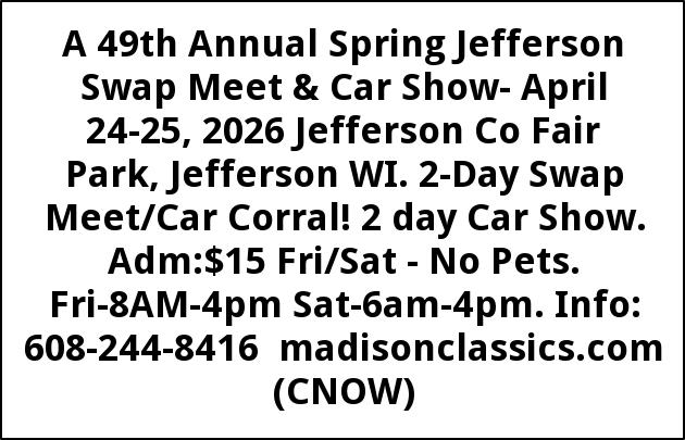 A 49th Annual Spring Jefferson Swap Meet & Car Show- April 24-25, 2026 Jefferson Co Fair Park, Jefferson WI. 2-Day Swap Meet/Car Corral! 2 day Car Show. Adm:$15 Fri/Sat - No Pets. Fri-8AM-4pm Sat-6am-4pm. Info: 608-244-8416 madisonclassics.com (CNOW)