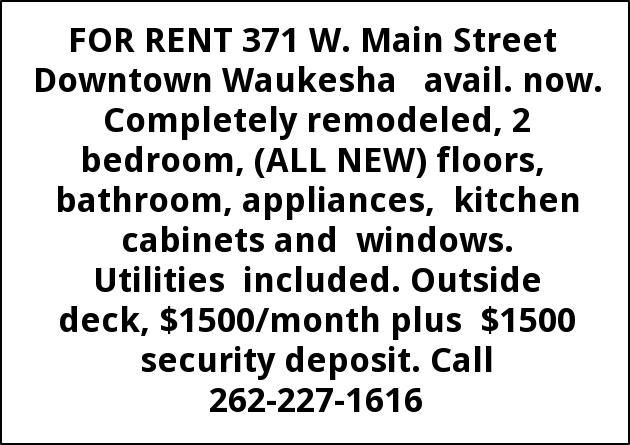 FOR RENT 371 W. Main Street Downtown Waukesha avail. now. Completely remodeled, 2 bedroom, (ALL NEW) floors, bathroom, appliances, kitchen cabinets and windows. Utilities included. Outside deck, $1500/month plus $1500 security deposit. Call 262-227-1616