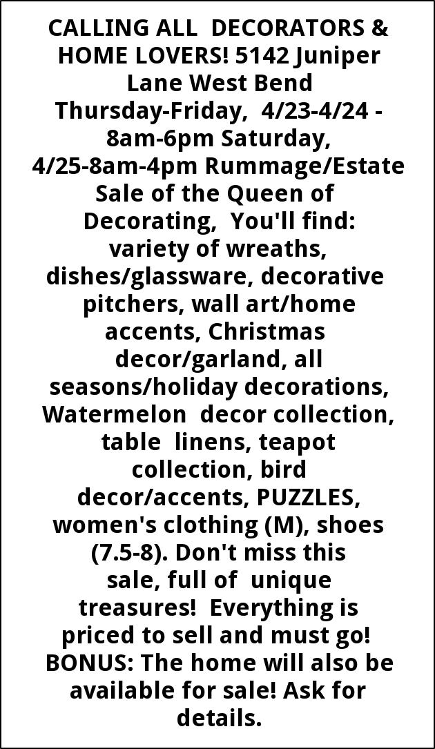 CALLING ALL DECORATORS & HOME LOVERS! 5142 Juniper Lane West Bend Thursday-Friday, 4/23-4/24 - 8am-6pm Saturday, 4/25-8am-4pm Rummage/Estate Sale of the Queen of Decorating, You'll find: variety of wreaths, dishes/glassware, decorative pitchers, wall art/home accents, Christmas decor/garland, all seasons/holiday decorations, Watermelon decor collection, table linens, teapot collection, bird decor/accents, PUZZLES, women's clothing (M), shoes (7.5-8). Don't miss this sale, full of unique treasures! Everything is priced to sell and must go! BONUS: The home will also be available for sale! Ask for details.