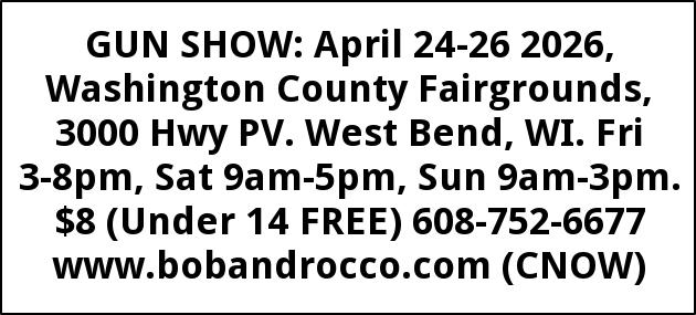 GUN SHOW: April 24-26 2026, Washington County Fairgrounds, 3000 Hwy PV. West Bend, WI. Fri 3-8pm, Sat 9am-5pm, Sun 9am-3pm. $8 (Under 14 FREE) 608-752-6677 www.bobandrocco.com (CNOW)
